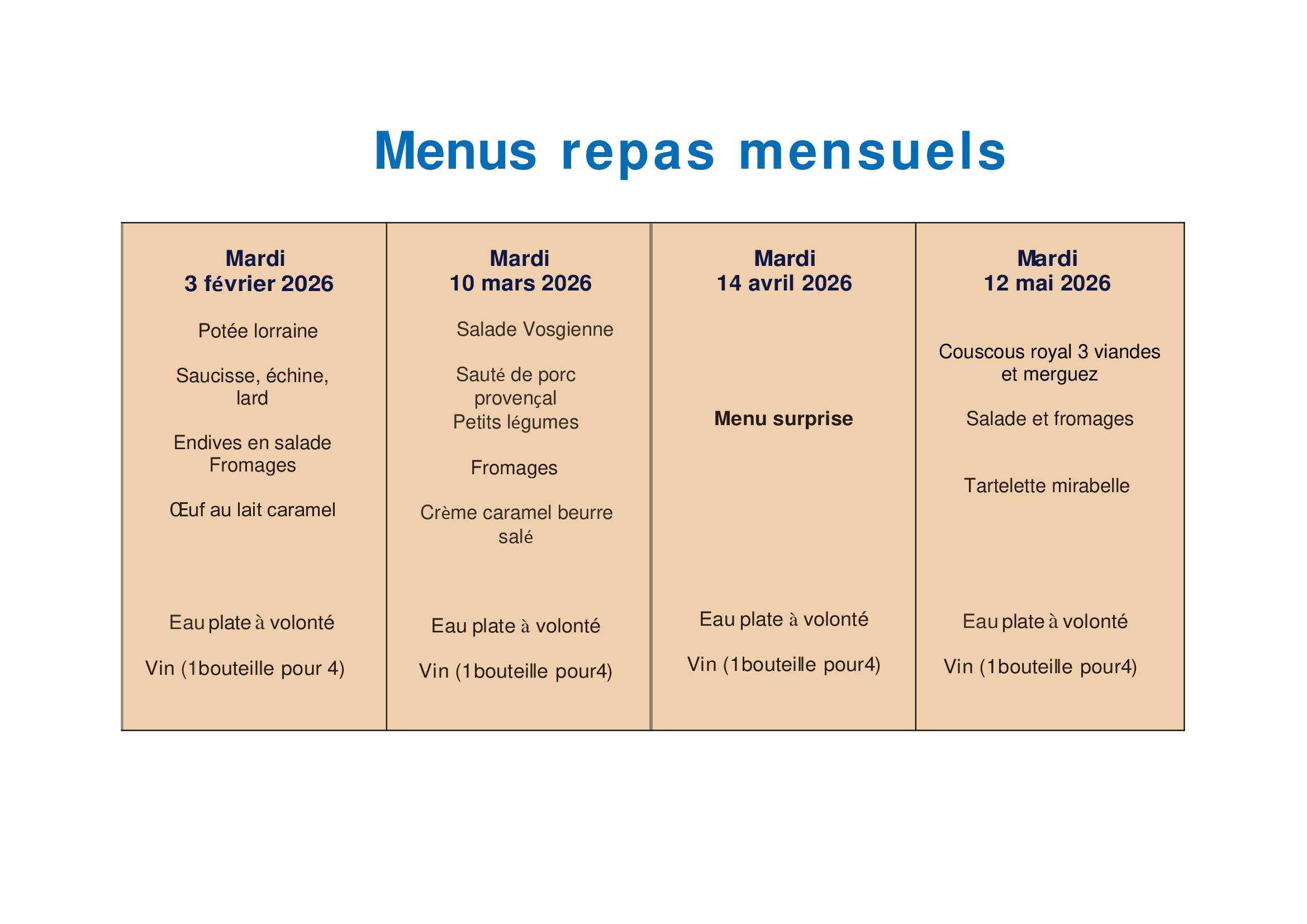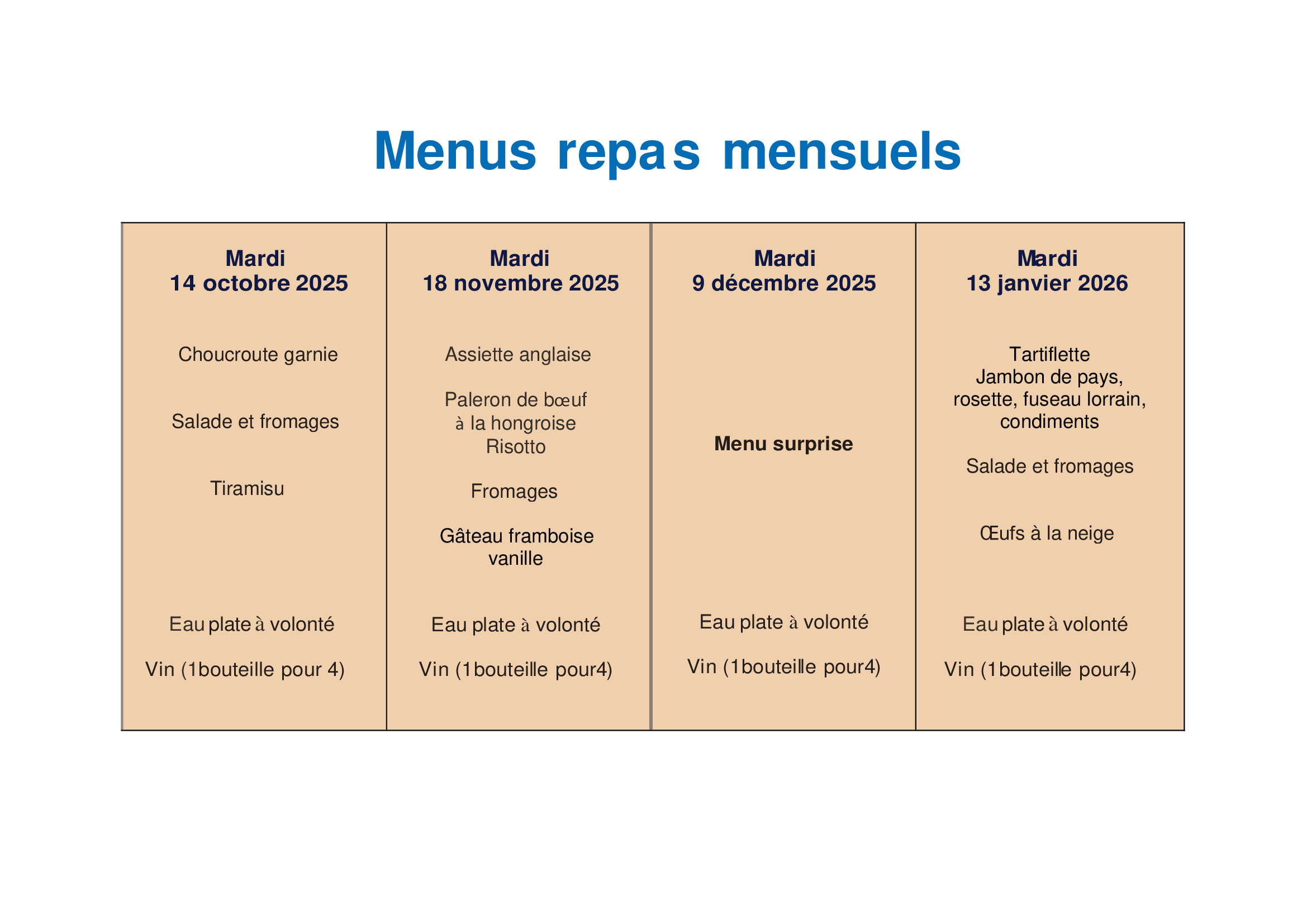 Dates des repas avec les menus de octobre 2025 à mai 2026.